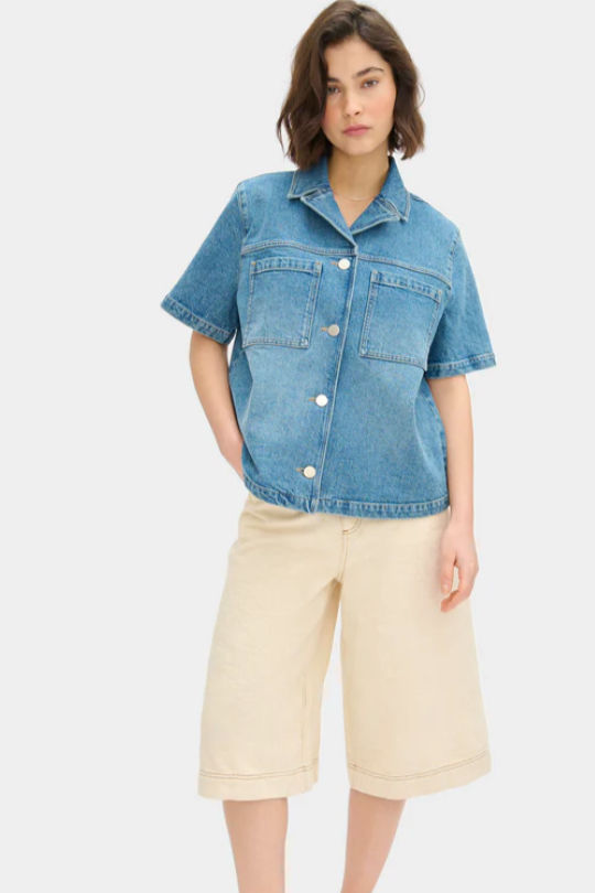 The boxy denim polo has that slightly sporty edge to it, relaxed but still structured enough to hold its shape. It’s easy, wearable, and feels like something you’ll keep reaching for.