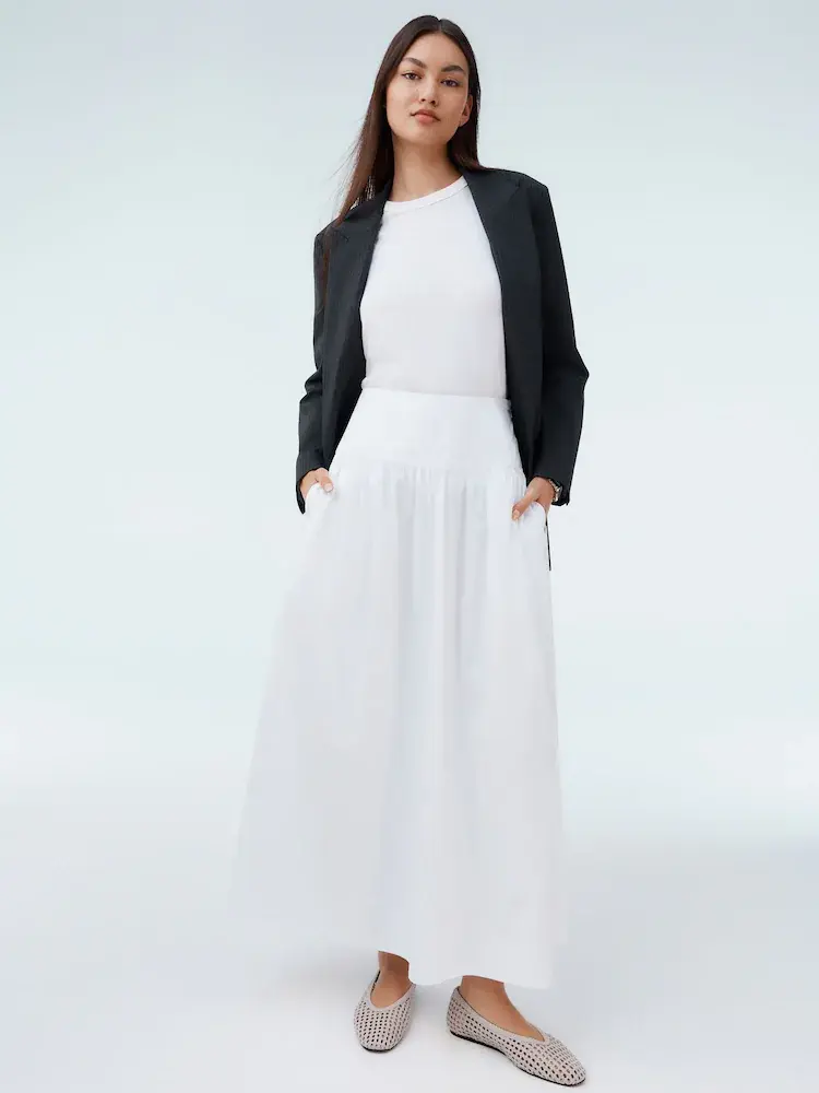 Emma is proving that mixing different textures is sometimes the easiest way to make a fit interesting. With a bold burgandy vintage leather jacket, the Arsenal 2025/26 Third Kit, a White Drop Waist Maxi Skirt, the classic Arsenal Bar Scarf and finishing it off a pop of colour with a pair of Adidas Gazelle's in Ash Green & White.
